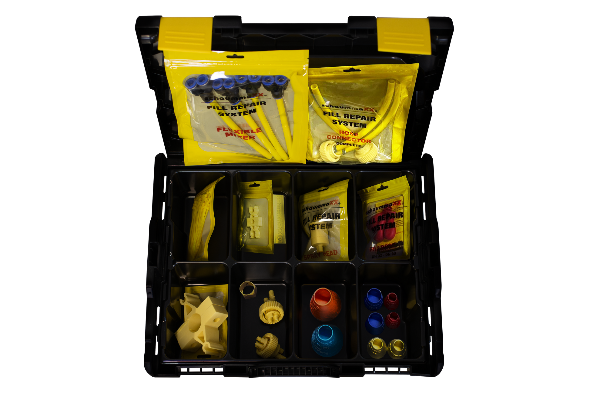 Das Starterset komplett enthält alle erforderlichen Komponenten für den Einsatz des Fill-Repair-Systems und wird in einer Transportkiste geliefert.